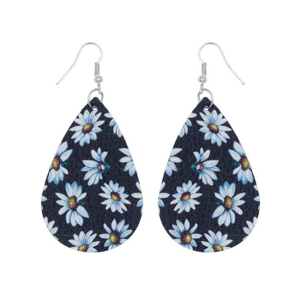 Silver Metal Fish Hook Earrings Featuring Black and White Daisy Printed Vegan Leather Teardrop. Earrings measure 1.5 inches wide.