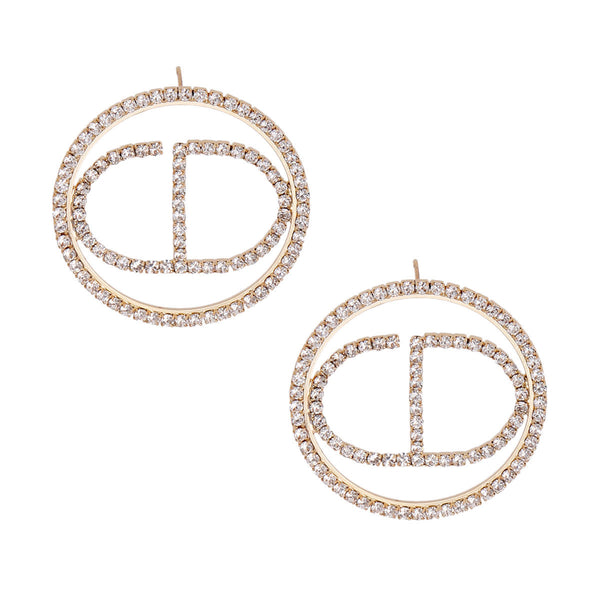 Women's Stud Earrings. Gold Metal Round Letter CD Stud Earrings Featuring Clear Rhinestone Detailing and Post Backing.