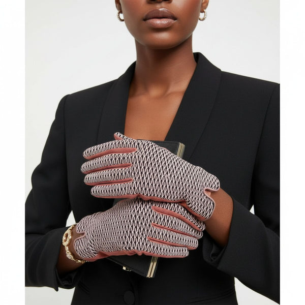 Women's Winter Gloves. Warm Pink and Black Cross Wave Pattern with Mauve Palm Underside Touchscreen Winter Gloves Featuring Trim Cuff Detail. Smartphone Friendly. Warm and Insulating Fleece Lined Interior. Stretch to Fit. One Size. Gloves Measure 9.5 inches Long. 100% Acrylic.
