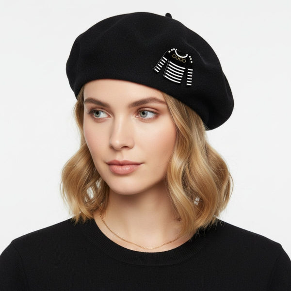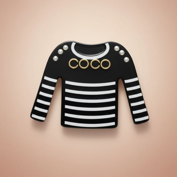Women's Brooch Pin and Hair Clip. Luxe French Designer Shirt Shaped Black Acrylic with White Stripes Brooch Hair Clip Featuring Silver Studs and COCO Detail. Silver Metal Safety Pin Hook Closure and Hair Clip. Can be worn as Brooch or Hair Clip.