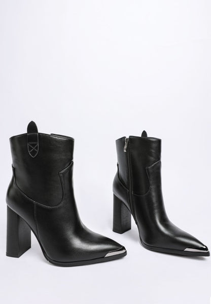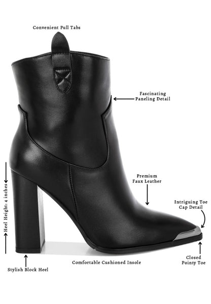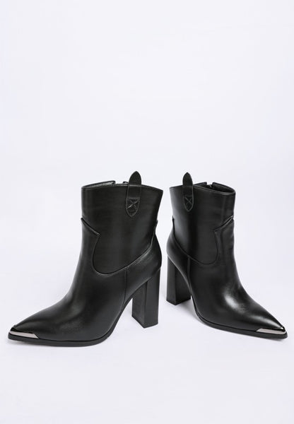 Channel that boss girl energy with these pointy toe faux leather boots. The block heel exudes an elevated vibe while the paneling detail adds a hint of contrast. Team these with your bodycon dresses for a look that demands attention.