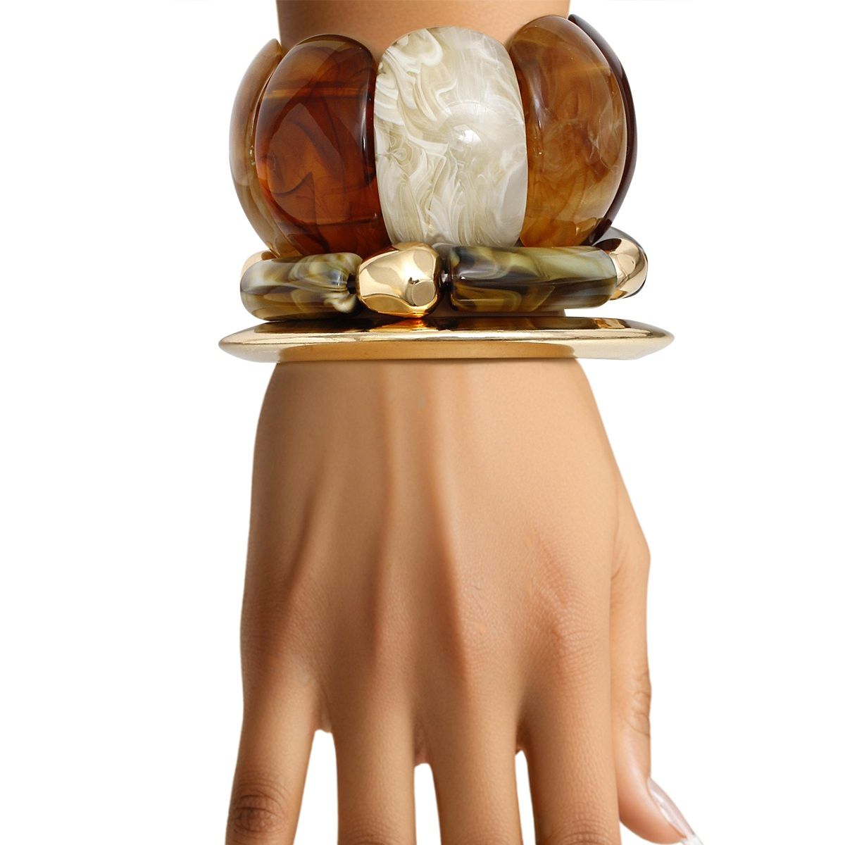 Women's Bangle Bracelet Set. Global Chic 3 Pcs Bracelet Set Featuring Polished Gold Acrylic Flat Edge Bangle, Wide Vintage Rich Brown Hue Marbled Acrylic Resin Curved Stretch Bracelet Measuring 1.75" Wide, and Marbled Olive Green and Brown Acrylic Resin Tubular Stretch Bracelet.