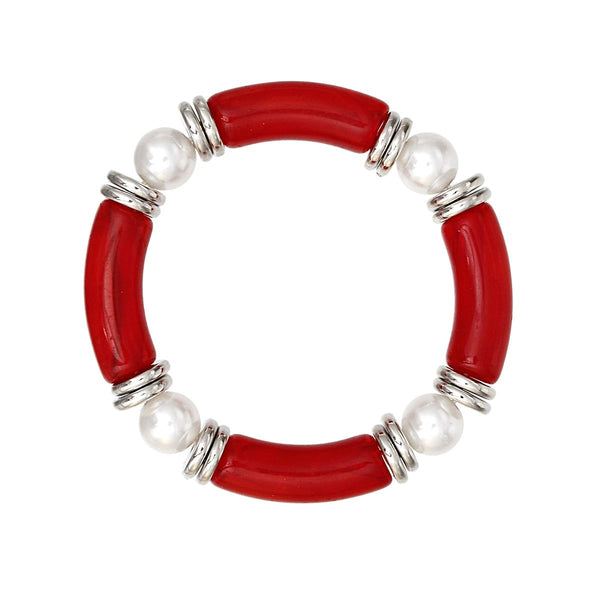 Delta Sigma Theta Sorority Paraphernalia Women's Stretch Bracelet. Elegant Marbled Red Acrylic Resin Tubular Bead Stretch Bracelet Featuring Silver Metal Spacers and Acrylic White Pearl Details. Perfect for Stacking.