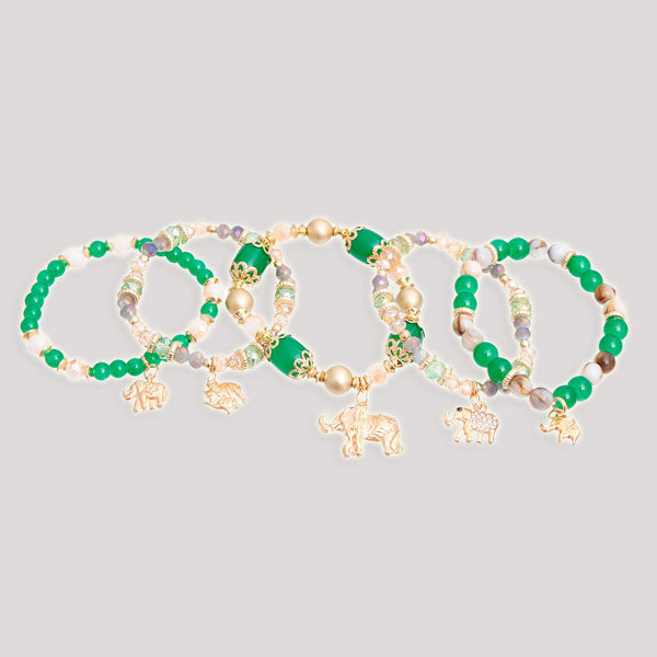 Gold with Green Glass Beads Stretch Bracelet Set Featuring Gold and Rhinestone Elephant Charms. 5 Pcs Set