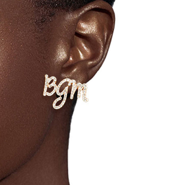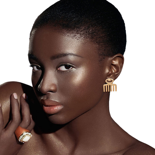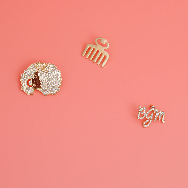 3 Pcs Gold Metal and Rhinestone Afro Centric Black Girl Themed Stud Earring Set. Set Includes: 1" BGM Rhinestone Studs. 1" Hair Pick Studs. 1.5" Rhinestone Afro Crown Woman Studs.