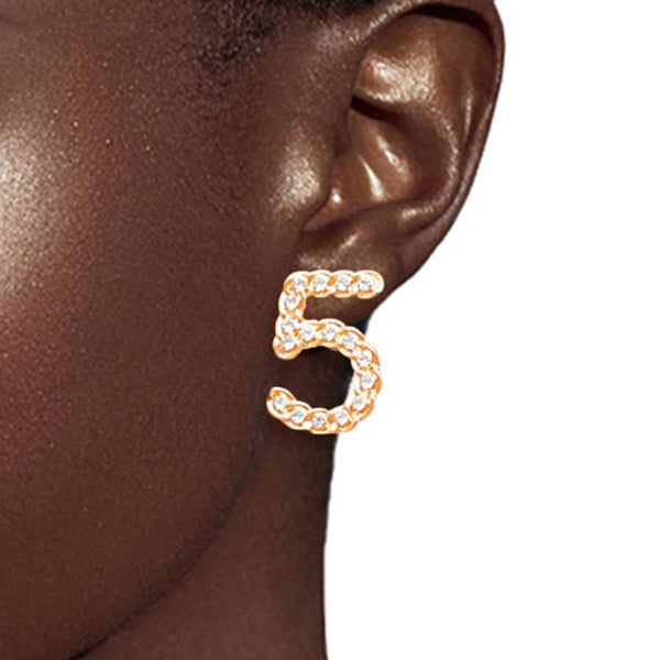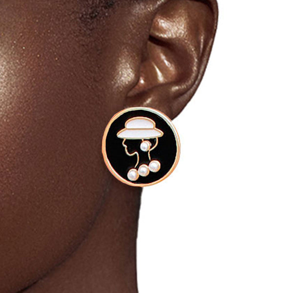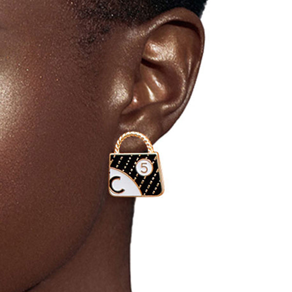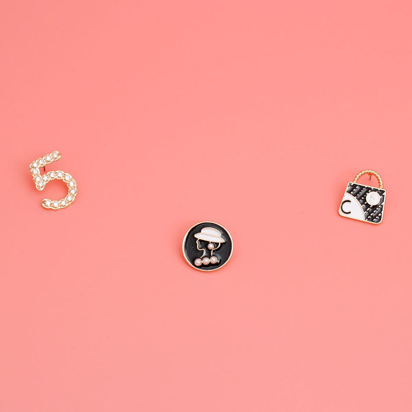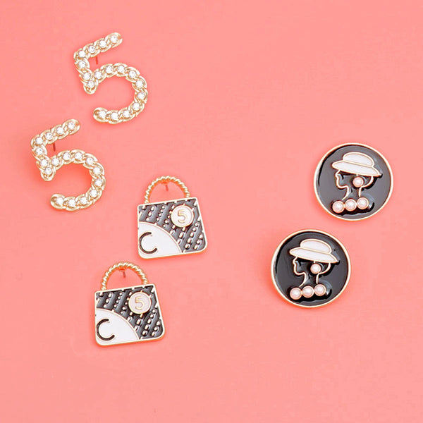 3 Pcs Designer Inspired Gold Metal, Rhinestone and Pearl Stud Earring Set. Set Includes: 1" 5 Chain Rhinestone Studs. .85" Round Black Epoxy Silhouette Pearl Studs. 1" Black and White Epoxy Handbag Studs.