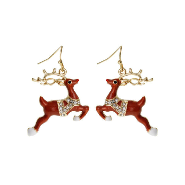 Gold Metal Fish Hook Earrings Featuring Brown Epoxy Reindeer Drop Detail. Earrings measure 1.25 inches wide.