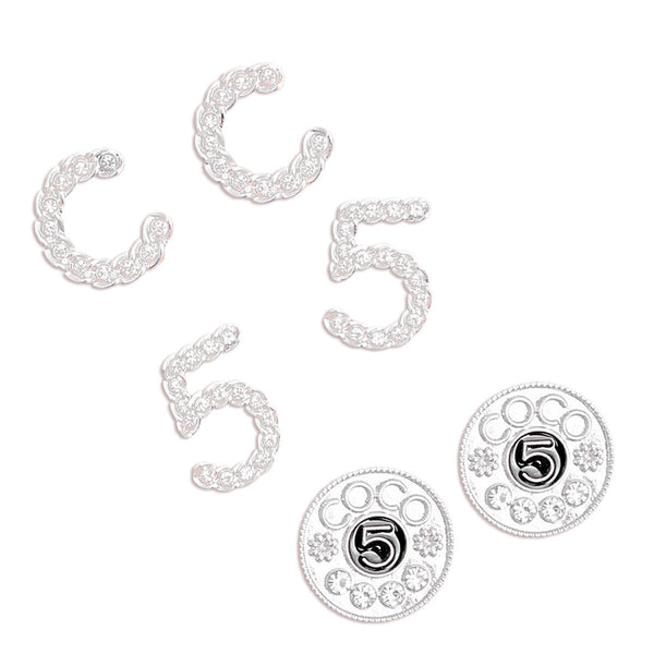 3 Pcs Designer Inspired Silver Metal and Rhinestone Stud Earring Set. Set Includes: 1" C Chain Rhinestone Studs. 1" 5 Chain Rhinestone Studs. 1" Round Coco 5 Black Epoxy and Rhinestone Studs.