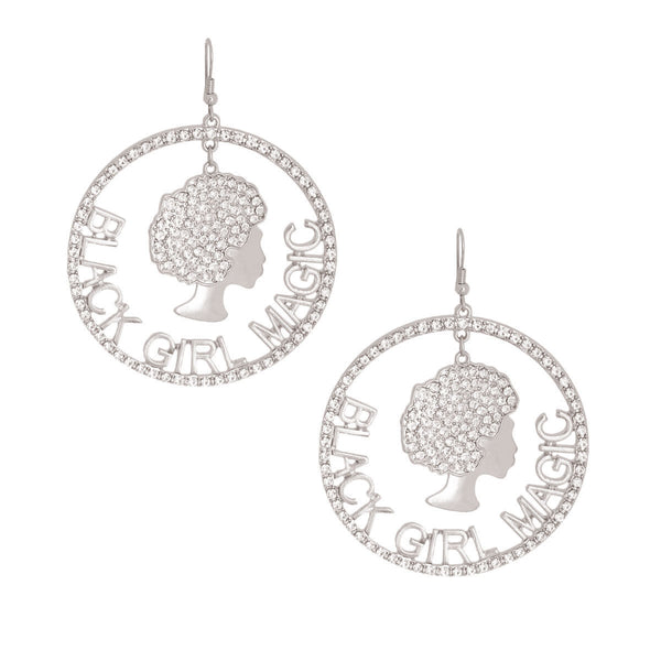 Silver Metal Fish Hook Earrings Featuring Rhinestone Drop Circle with Black Girl Magic Afro Detailing