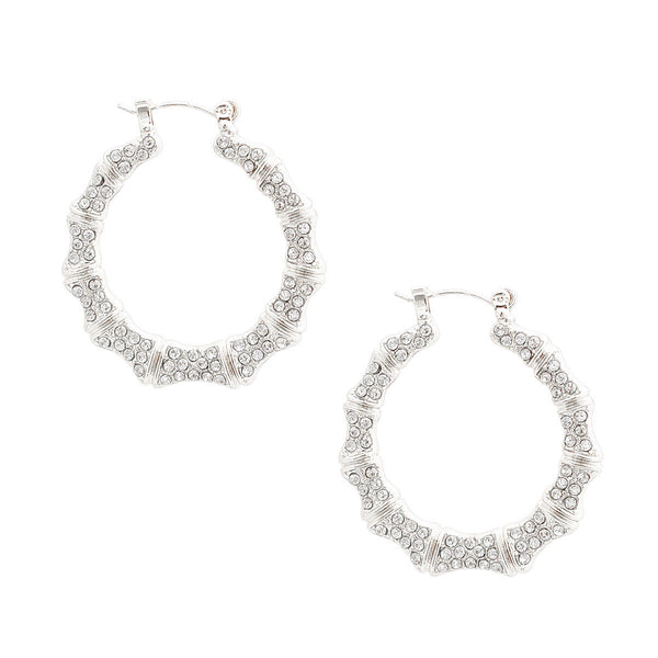 Silver Metal and Clear Rhinestone Thin Bamboo Hoop Earrings. Earrings measure 1.35 inches wide.