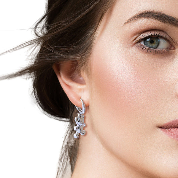 Silver Metal Huggie Hoop Earrings Featuring Teddy Bear Charm Drop Detail. Earrings measure .47 inches wide