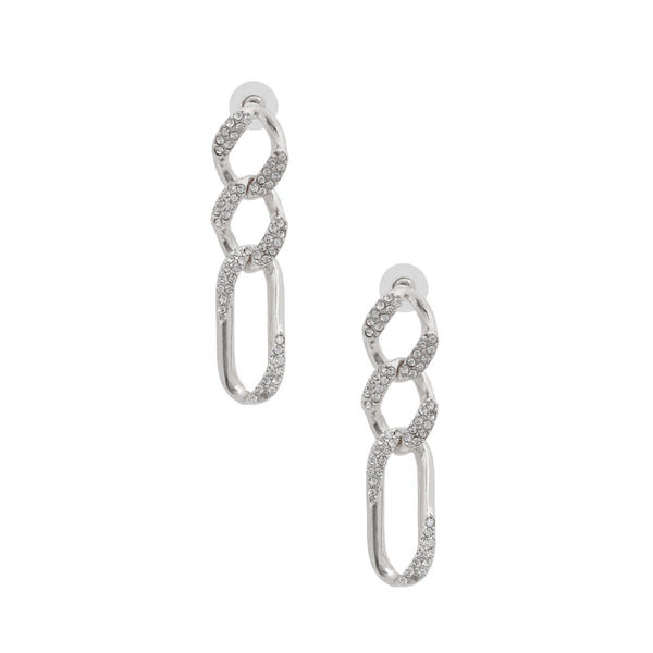 Silver Metal Oblong Chain Link Drop Earrings Featuring Clear Rhinestone Detailing. Earrings measure .75 inches wide.