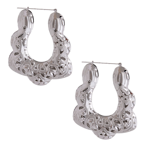 Silver Metal Hollow Trapezoid Filigree Bamboo Style Hoop Earrings. Earrings measure 2.75 inches wide