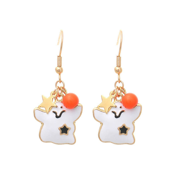 Gold Metal Fish Hook Earrings Featuring White Epoxy Metal Halloween Ghost with Black Star and Charm Details. Earrings measure .7 inches wide.