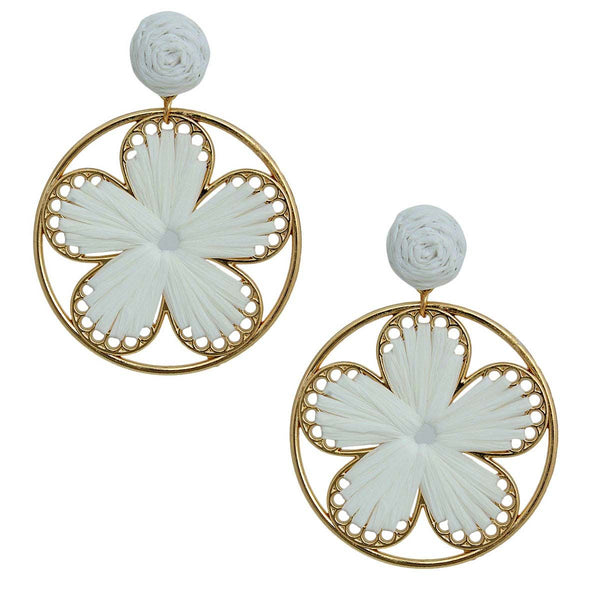 White Raffia and Gold Metal Round Drop Earrings Featuring Flower Detail. Earrings measure 1.85 inches wide.