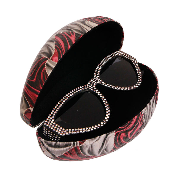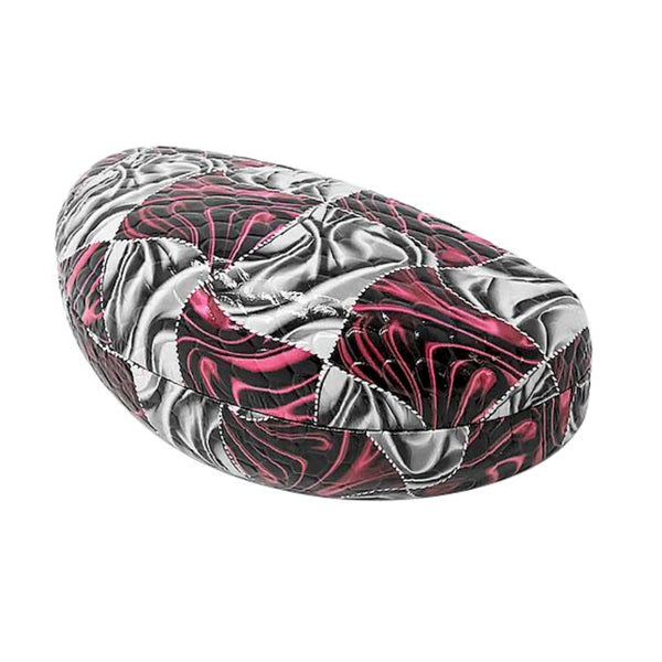 Gray and Pink Wavy Checkerboard Pattern Clamshell Sunglass Hard Case. Interior has Black Velvet Lining. Hinge Closure. *Sunglasses not Included