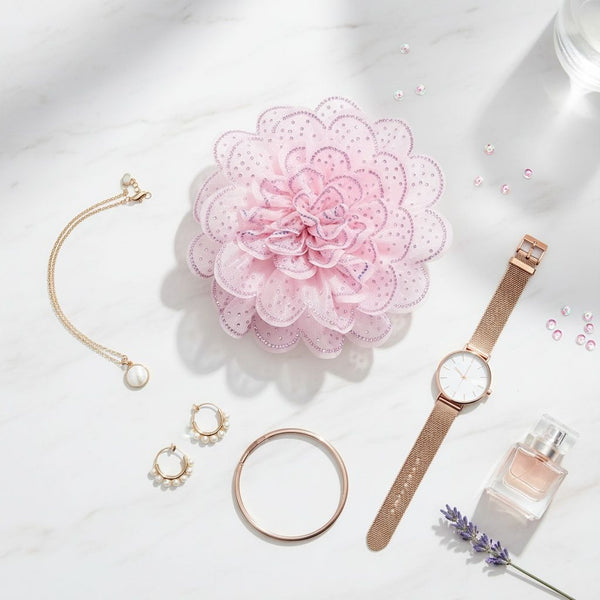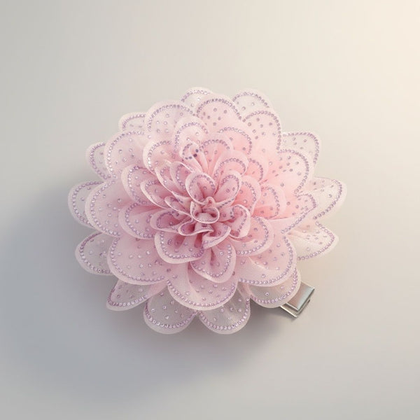 Women's Multi Use Brooch and Hair Clip. Elegant Camellia-Style Flower Accessory Featuring Layered Pink Polymesh Fabric Petals with Sparkling Rhinestone Detailing for a Soft Yet Glamorous Finish. Designed with a Versatile Backing. Can be Worn as a Brooch, Hair Clip, or on a Pony. Includes Black Stretch Ponytail Holder. Silver Metal Safety Pin Brooch Closure Plus Metal Claw Hair Clip.