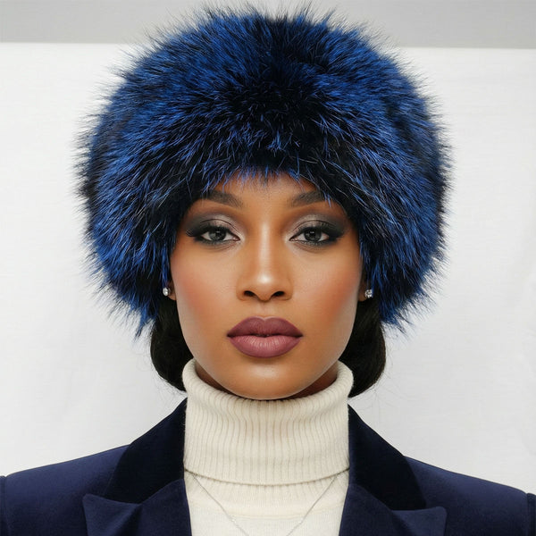 Women's Winter Hat. Instant Glamor Luxe Faux Fur Bold Multi-tone Blue and Black Kubanka Style Winter Hat. Ultra-Soft, and Effortlessly Chic. Perfect Statement Accessory for Cold Weather Winter Styling. Black Quilted Interior Lining. Cap Measures 6 inches Long and 7.5 inches Wide on Top. 100% Polyester.