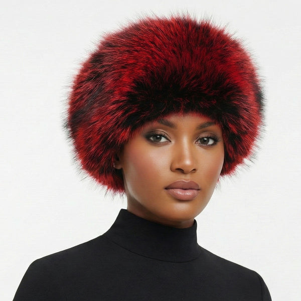 Women's Winter Hat. Instant Glamor Luxe Faux Fur Bold Multi-tone Red and Black Kubanka Style Winter Hat. Ultra-Soft, and Effortlessly Chic. Perfect Statement Accessory for Cold Weather Winter Styling. Black Quilted Interior Lining. Cap Measures 6 inches Long and 7.5 inches Wide on Top. 100% Polyester.