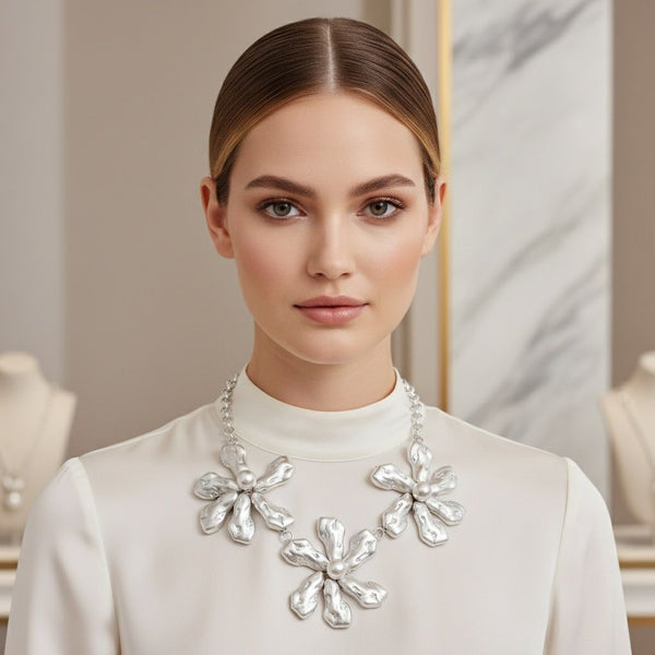 Women's Bib Necklace. Bold Chunky Floral Energy Bib Necklace Featuring Three Large Flowers with Hollow Acrylic Matte Silver Petals in Thick Organic Shapes Suspended From a Sturdy Matte Silver Metal Round Link Chain Neckline. Striking Boutique Look. Each Flower Measures 3.5 inches. Lobster Clasp Closure.
