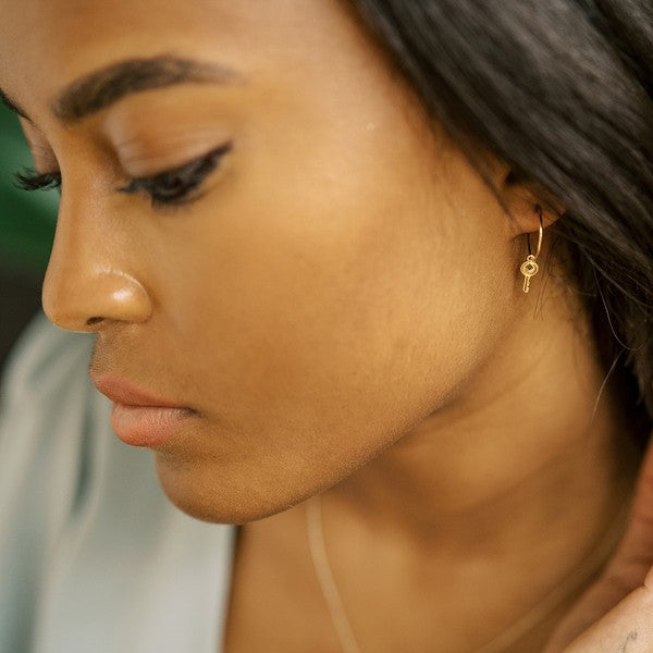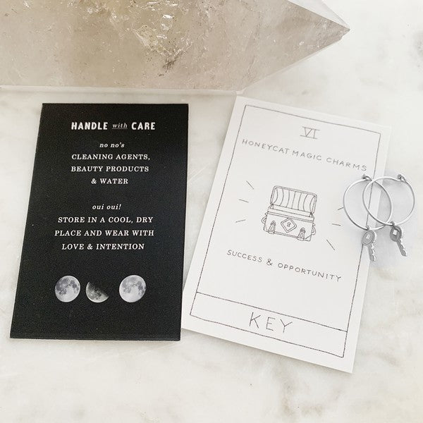 Minimalist, skinny hoops accented with tiny key charms. Each set of earrings comes with a unique, illustrated tarot inspired card, which makes this item gift giving ready. Our earrings are plated with 18k gold, 18k rose gold, or rhodium and finished with a protective coating.