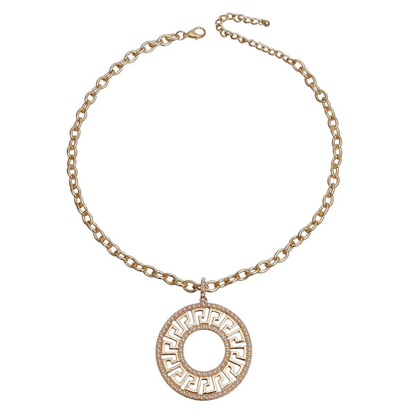 Gold Metal Cable Chain Necklace Featuring Designer Inspired Round Metal Circle Greek Key Pendant with Cream Pearl Detailing. Pendant measures 2.5 inches long.