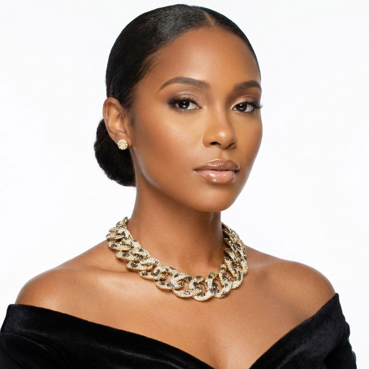 Women's Chain Necklace Set. Wild Child Chunky Gold Acrylic Curb Chain Necklace Encrusted with Shimmering Leopard Pattern Rhinestone Detailing. Chain Measures 1.35" Wide. Gold Metal Lobster Clasp Closure. Includes Rhinestone Post Backing Stud Earrings.