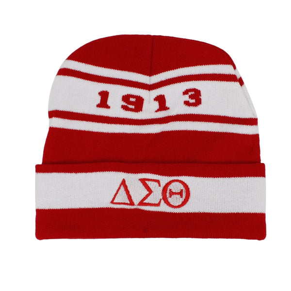 Delta Sigma Theta Sorority Paraphernalia Women's Beanie Hat. DST Sorority Merch Red and White Stripe Knit Winter Beanie Hat Featuring 1913 Print and Embroidered DST Greek Letter Detail on Folded Brim. 100% Acrylic. Winter Sorority Apparel.