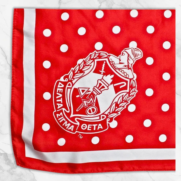 Delta Sigma Theta Sorority Paraphernalia. Women's Greek Merch. Sorority Licensed Women's Scarf. Elegant Delta Sigma Theta Red and White Silky Square Scarf Featuring Red Trim, Red with White Polka Dot Print, Plus DST Greek Letters and Shield Corners. Silky 100% Polyester. Hand Wash Gently with Mild Detergent.