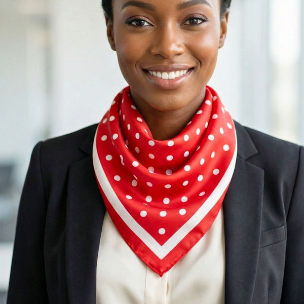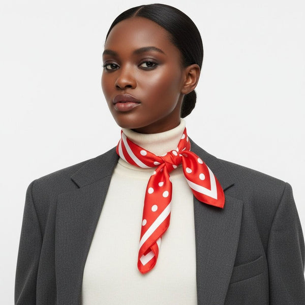 Women's Silky Square Scarf. Polished, Graceful, and Timeless. Red and White Silky Square Scarf Featuring Red Trim and Red with White Polka Dot Print. Everyday Elegance. Silky 100% Polyester. Hand Wash Gently with Mild Detergent.