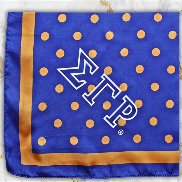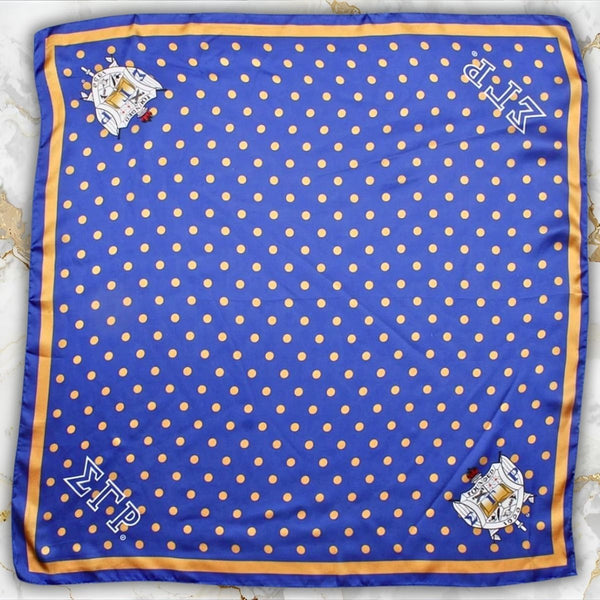 Sigma Gamma Rho Sorority Paraphernalia. Women's Greek Merch. Sorority Licensed Women's Scarf. Elegant Sigma Gamma Rho Blue and Mustard Yellow Silky Square Scarf Featuring Blue Trim, Blue with Mustard Yellow Polka Dot Print, Plus SGRHO Greek Letters and Shield Corners. Silky 100% Polyester. Hand Wash Gently with Mild Detergent.