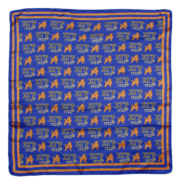 Sigma Gamma Rho Sorority Paraphernalia. Women's Greek Merch. Sorority Licensed Women's Scarf. Elegant Sigma Gamma Rho Dark Blue and Mustard Yellow Silky Square Scarf Featuring Blue Stripe Trim Plus Dark Blue with Mustard Yellow Poodle, Black with Yellow Outline SGRHO Greek Letters, and Yellow 1922 Repeating Line Pattern Print. Silky 100% Polyester. Hand Wash Gently with Mild Detergent.