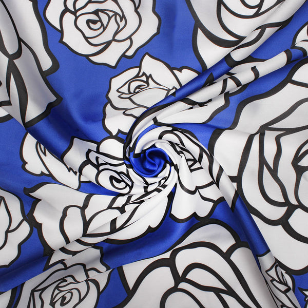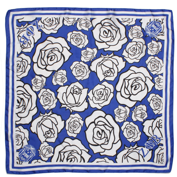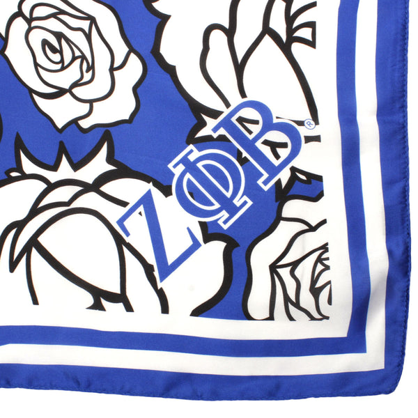 Zeta Phi Beta Sorority Paraphernalia. Women's Greek Merch. Sorority Licensed Women's Scarf. Elegant Zeta Phi Beta Blue and White Silky Square Scarf Featuring Blue Stripe Trim, White with Black Outline Flower Rose Print, Plus ZPB Greek Letters and Shield Corners. Silky 100% Polyester. Hand Wash Gently with Mild Detergent.