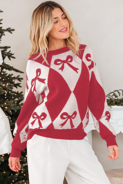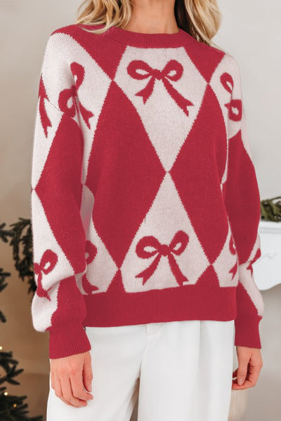 Bow Colorblock Rhombus Drop Shoulder Sweater