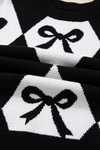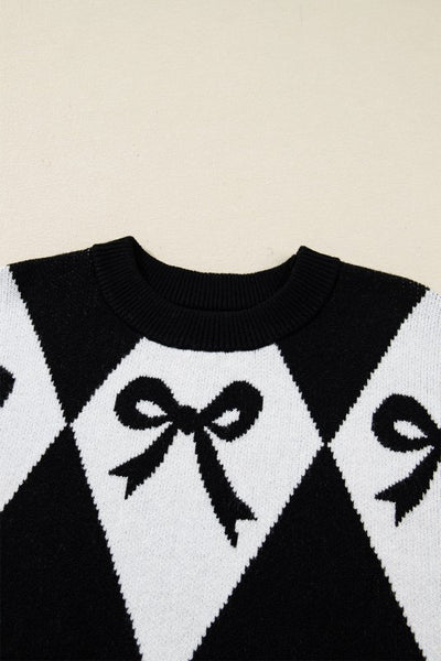 Get ready to turn heads with this playful black and white sweater featuring a harlequin-inspired colorblock rhombus pattern and trendy bow accents. Its relaxed fit and drop shoulder style make it comfy and flattering for almost everyone. Made from high-quality knit, it pairs perfectly with any bottoms and stays looking fresh without stretching or pilling. Viscose/Polyester/Poly