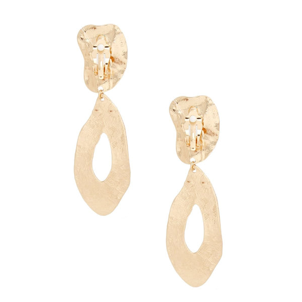 Women's Clip On Earrings. Edgy and Raw Textured Gold Metal Melted-Look Elongated Organic Teardrop Clip On Earrings. Paddle Back Clip On Closure.