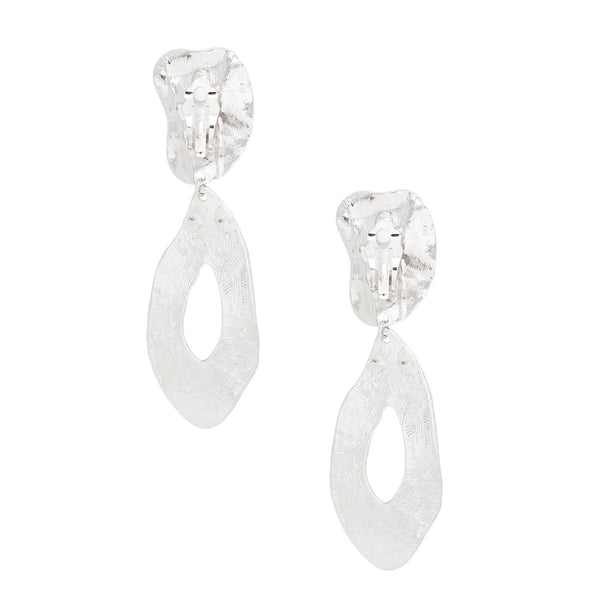 Women's Clip On Earrings. Edgy and Raw Textured Silver Metal Melted-Look Elongated Organic Teardrop Clip On Earrings. Paddle Back Clip On Closure.