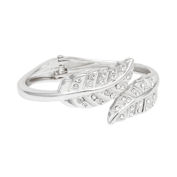 Women's Cuff Bracelet. Polished Silver Metal Hinge Closure Cuff Bracelet Featuring Delicate yet Bold Textured Leaves with Clear Rhinestone Details. Leaves Measure 2.25" x 1".