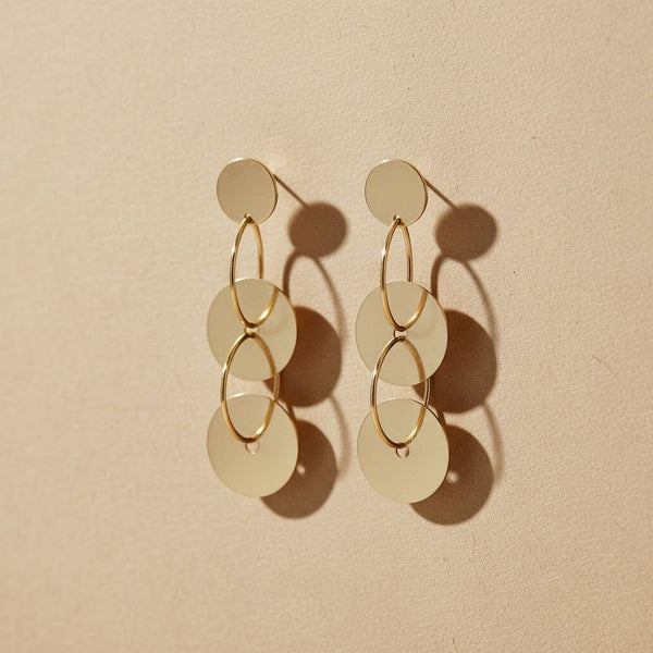 Women's Dangle Earrings. Gold Metal Disc Dangle Earrings Linked Together With Gold Rings. Post Backing.