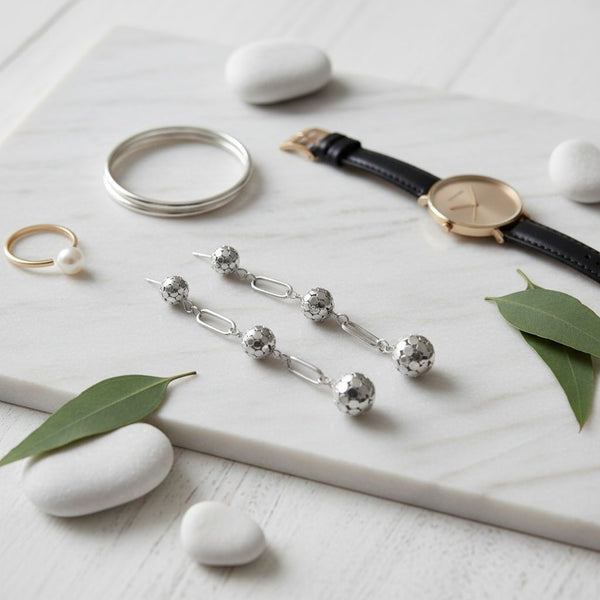 Dangle Silver Linked Mesh Ball Long Drop Earrings