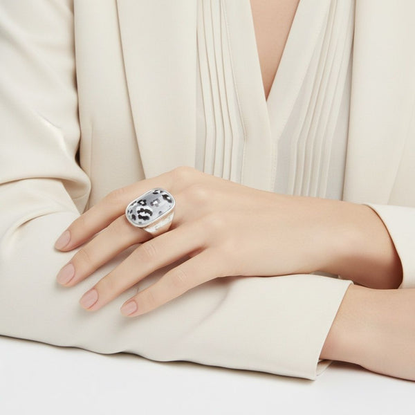 Women's Cocktail Ring. Wild Tribal Chunky Elongated Cocktail Ring Featuring Domed Thick White Resin with Gray Leopard Print Painted Detailing. Stretch Silver Metal Band. Detail Measures 1.25 inches x .75 inches.