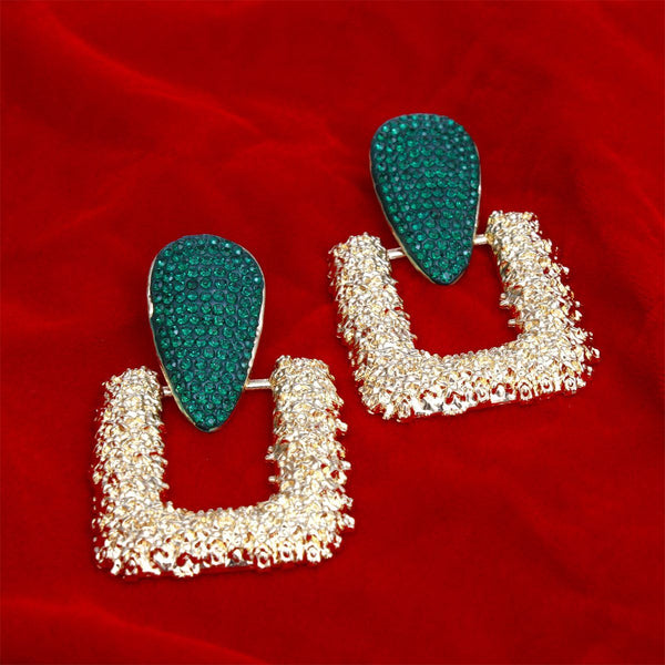 Women's Drop Earrings. Edgy Gold Metal and Green Rhinestone Inverted Teardrop Earrings Featuring Hinged Gold Melted Metal Texture Square Drop Detail. Post Backing.