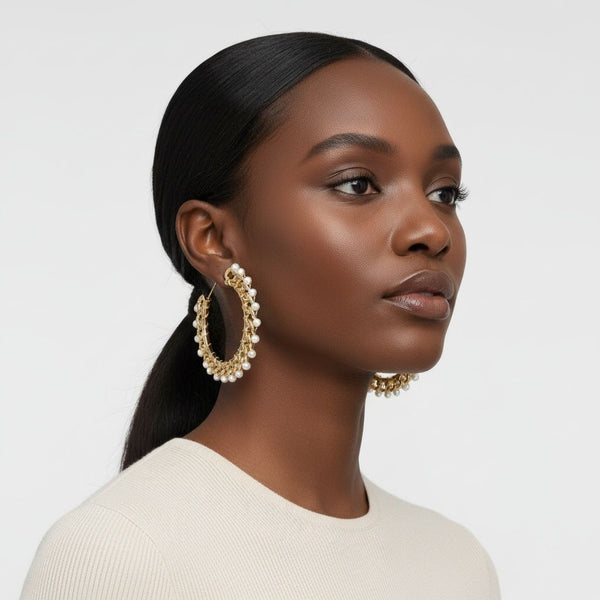 Gold Chain Open Hoops with Cream Pearl Earrings