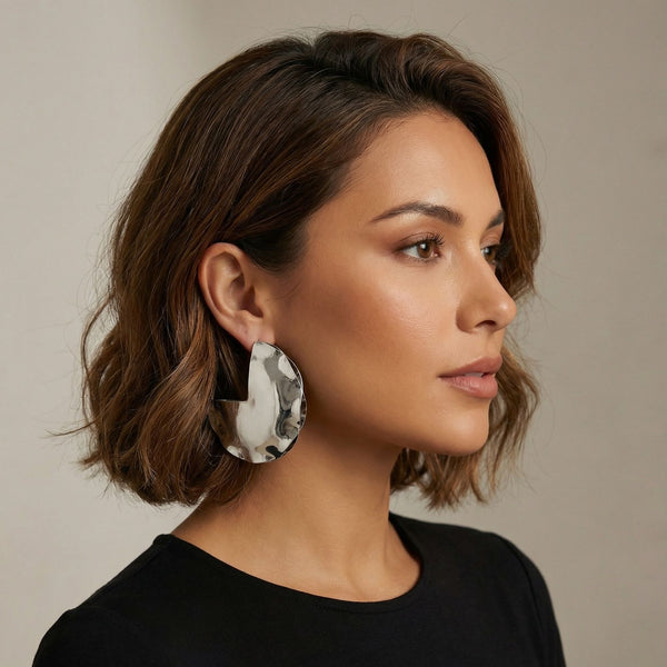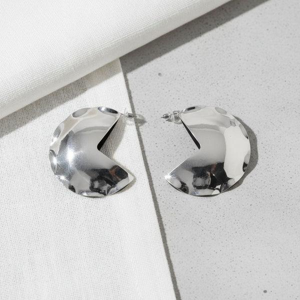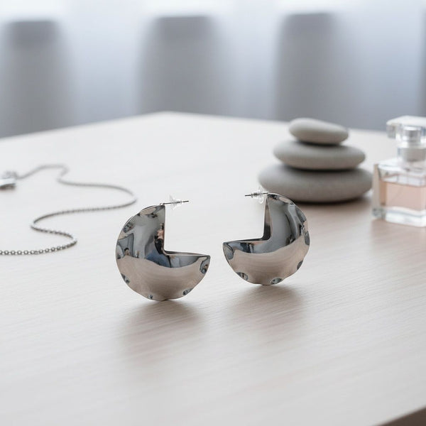 Women's Open Hoop Earrings. High Shine Polished Silver Metal Puffy Round Disc Pinched Metal Hoop Earrings Featuring Abstract Cutout Design. Post Backing.