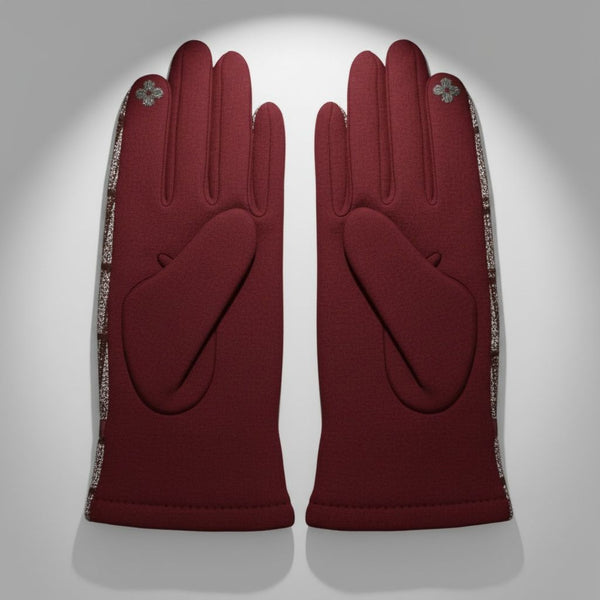 Women's Winter Gloves. Warm Wine Red with Brown Plaid and Faux Leather Belt Detail Touchscreen Winter Gloves. Smartphone Friendly. Warm and Insulating Fleece Lined Interior. Stretch to Fit. One Size. Gloves Measure 9.25 inches Long. 60% Acrylic and 40% Polyester.
