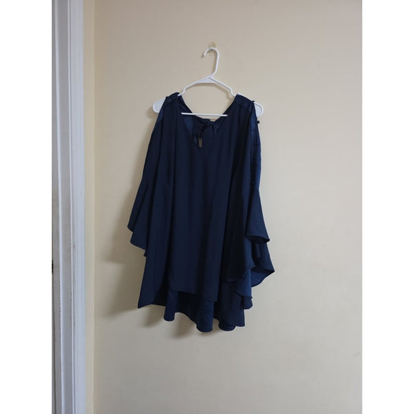 This is a stylish navy blouse from Lane Bryant, featuring a flowing design with layered sleeves. Perfect for a casual or semi-formal occasion.