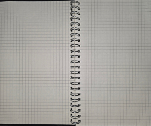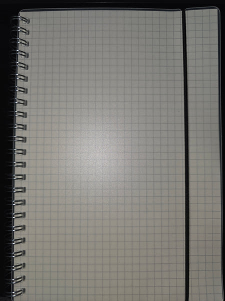 A spiral-bound notebook featuring grid paper, ideal for note-taking or sketching. It includes an elastic closure to keep the pages secure.