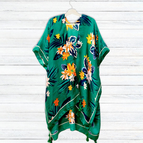 Cubierta de playa tipo kimono ligera con estampado floral tropical verde y detalles de borlas. 100% poliéster. Talla única.