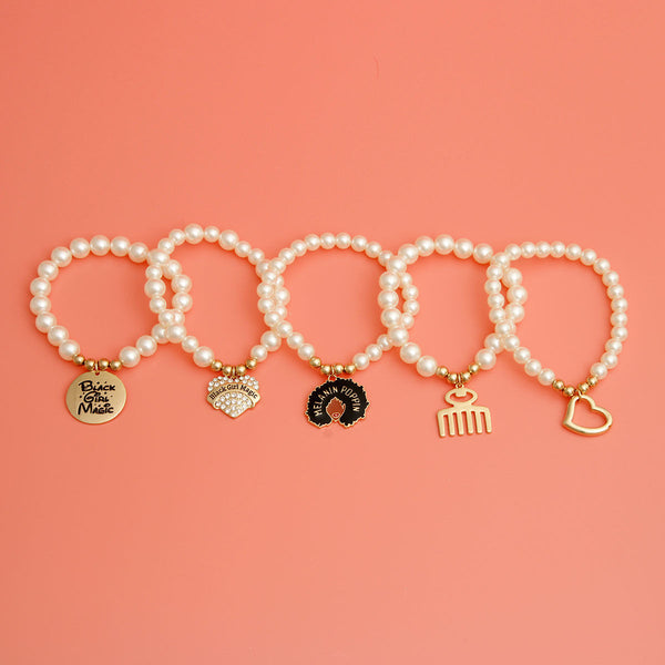 Cream Pearl Stretch Bracelet Set Featuring Gold Metal Black Girl Magic and Melanin Afro Charms. 5 Pcs Set. Round Black Girl Magic Charm measures 1.15 inches. Melanin Poppin Charm measures 1.25 inches.