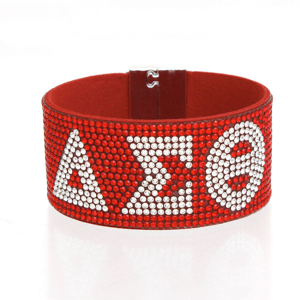 Delta Sigma Theta Sorority Paraphernalia Women's Magnetic Bracelet. Thick Red Felt Canvas Bracelet Featuring 16 Rows of Red Rhinestones with Clear Rhinestone DST Greek Letter Detail. Silver Metal Magnetic Closure.